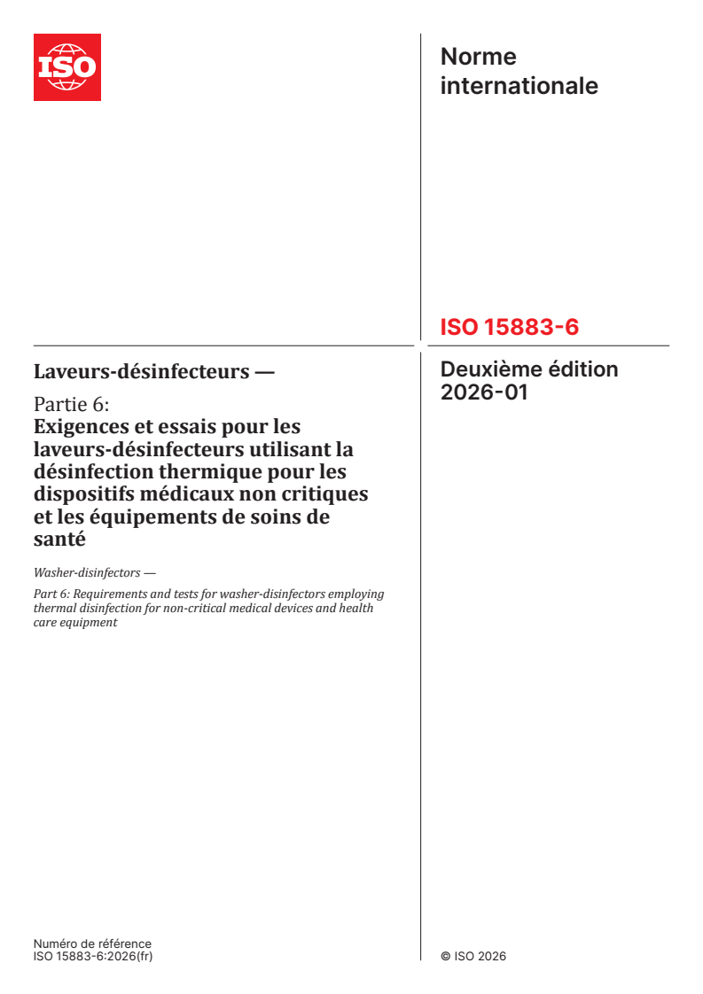 ISO 15883-6:2026 - Laveurs-désinfecteurs — Partie 6: Exigences et essais pour les laveurs-désinfecteurs utilisant la désinfection thermique pour les dispositifs médicaux non critiques et les équipements de soins de santé Released:26. 01. 2026