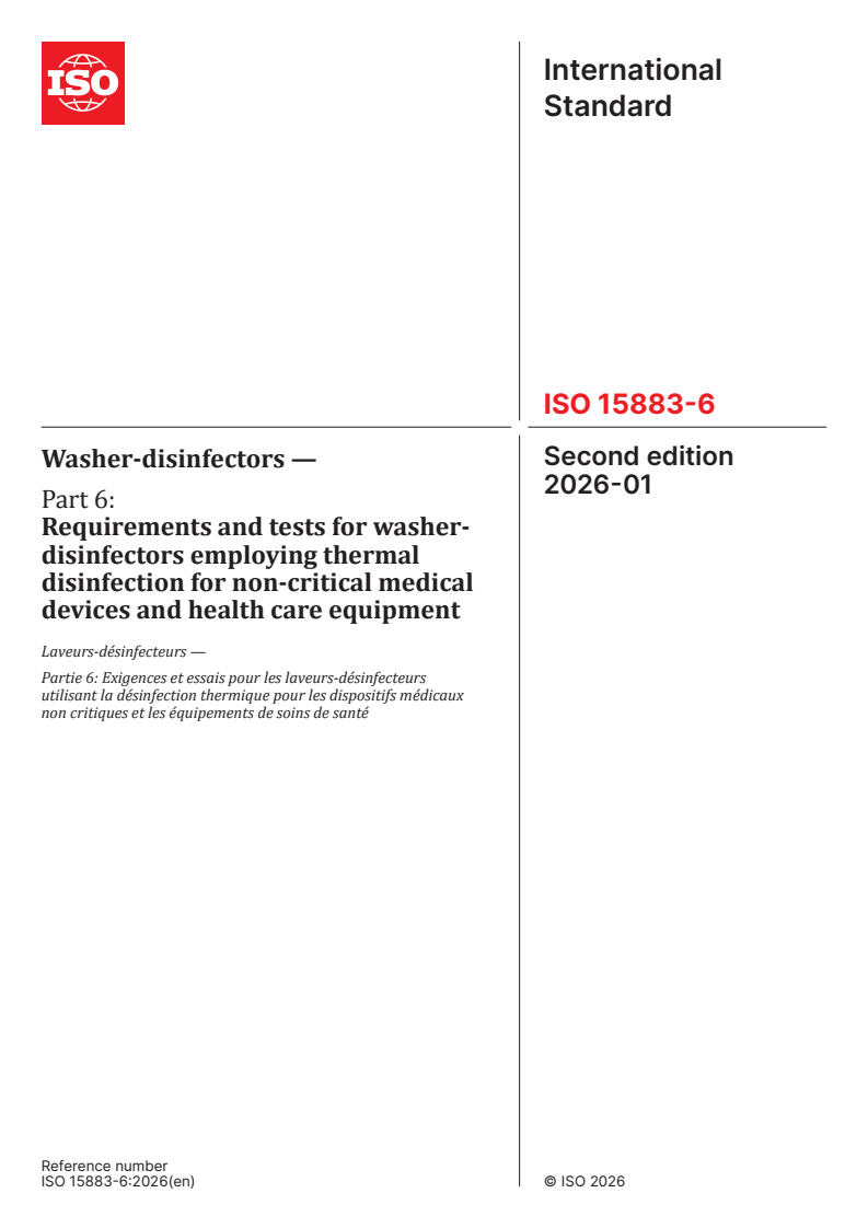 ISO 15883-6:2026 - Washer-disinfectors — Part 6: Requirements and tests for washer-disinfectors employing thermal disinfection for non-critical medical devices and health care equipment Released:26. 01. 2026