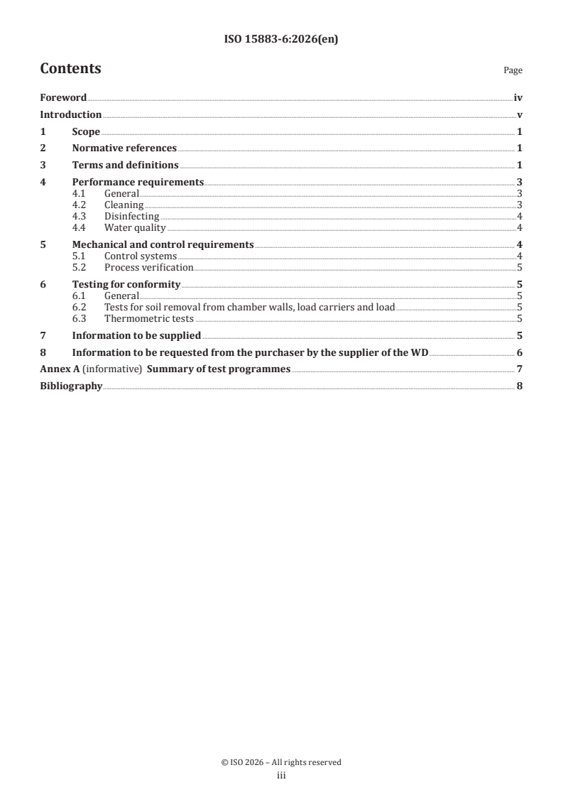 ISO 15883-6:2026 is a standard published by the International Organization for Standardization (ISO). Its full title is "Washer-disinfectors — Part 6: Requirements and tests for washer-disinfectors employing thermal disinfection for non-critical medical devices and health care equipment". This standard covers: This document specifies particular requirements for washer-disinfectors (WD) intended for use when the level of assurance of disinfection that is necessary can be achieved by cleaning and thermal disinfection (A0 not less than 60) and does not require an independent automated record of critical processes to be kept. It is intended to be used in conjunction with ISO 15883-1, which specifies general requirements for WD. The range of products on which WD of this particular type can be used is restricted to non-invasive and non-critical devices and equipment (i.e. not penetrating skin or contacting mucosal surfaces). NOTE Thermal disinfection can be achieved by rinsing the load with hot water, exposure to steam, or combination of the two. This document does not cover powered devices, lumened devices, and other semi-critical and critical medical devices. Devices identified within the scopes of ISO 15883-2, ISO 15883-3, ISO 15883-4, and ISO 15883-7 do not fall within the scope of this document.