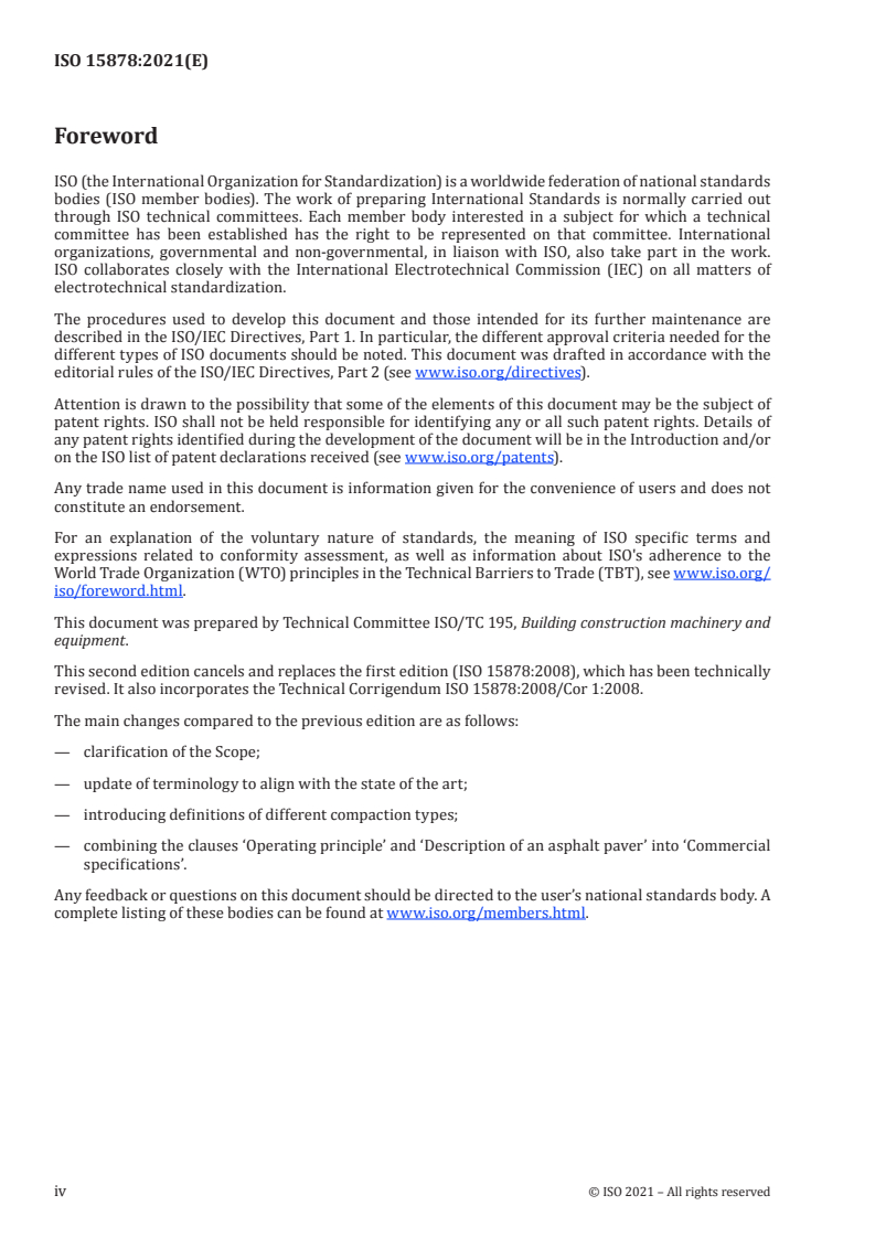 ISO 15878:2021 is a standard published by the International Organization for Standardization (ISO). Its full title is "Road construction and maintenance equipment — Paver-finishers — Commercial specifications". This standard covers: This document establishes the content for commercial specifications for paver-finishers used in road construction and maintenance processes for the placement and pre-compaction of paving materials. It covers the machine and its components and establishes parameters for technical characteristics for both. This document does not cover commercial specifications for road wideners which can perform similarly to a paver-finisher under certain conditions.