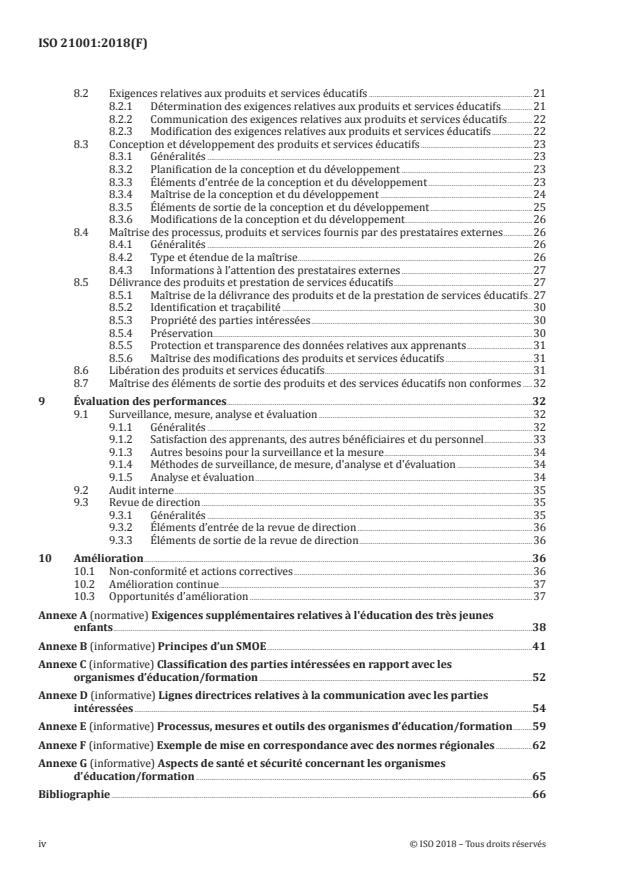 L'ISO 21001:2018 spécifie des exigences relatives à un système de management pour les organismes d'éducation/formation (SMOE) lorsqu'un tel organisme: a) doit démontrer son aptitude à favoriser l'acquisition et le développement de compétences par le biais de l'éducation, de la formation, de l'apprentissage ou de la recherche; b) vise à accroître la satisfaction des apprenants, des autres bénéficiaires et du personnel par l'application efficace de son SMOE, y compris les processus pour l'amélioration du système et l'assurance de la conformité aux exigences des apprenants et des autres bénéficiaires. Toutes les exigences du présent document sont génériques et prévues pour s'appliquer à tout organisme qui utilise un programme d'études pour favoriser le développement de compétences par le biais de l'éducation, de la formation, de l'apprentissage ou de la recherche, quels que soient son type, sa taille ou les méthodes de prestation. L'ISO 21001:2018 peut s'appliquer à des organismes d'éducation/formation au sein d'organismes de plus grande taille dont l'activité principale n'est pas l'éducation, tels que des services de formation professionnelle. L'ISO 21001:2018 ne s'applique pas aux organismes qui produisent ou fabriquent uniquement des produits éducatifs.