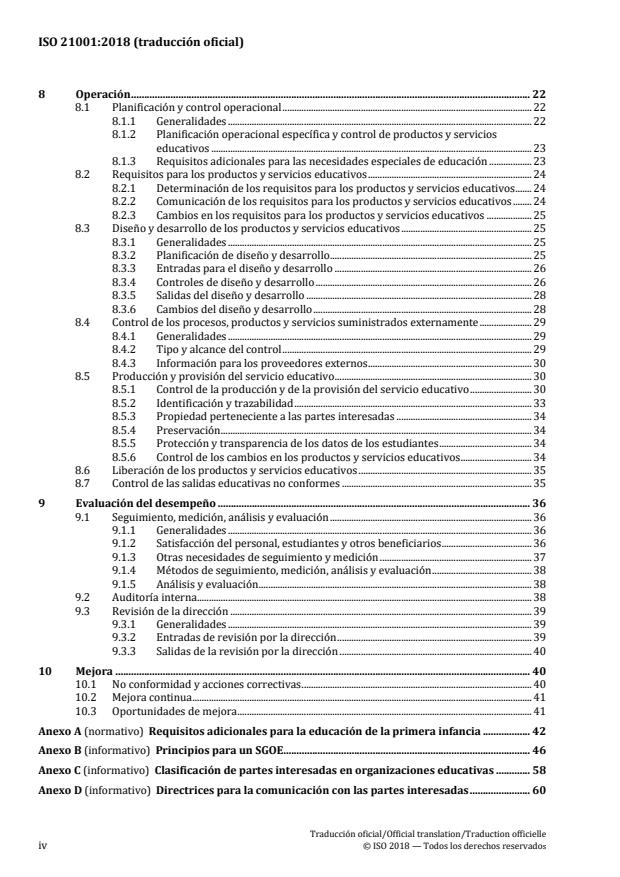 - Operation: operational planning and control of educational products and services, design and development of curricula and learning services, control of externally provided processes, delivery, protection of learner data and nonconforming outputs.