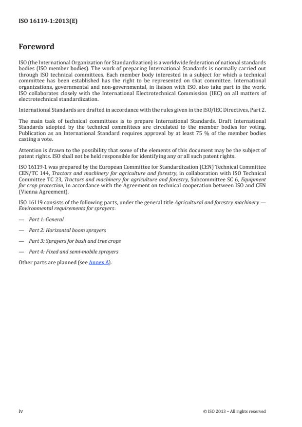 ISO 16119-1:2013 is a standard published by the International Organization for Standardization (ISO). Its full title is "Agricultural and forestry machinery - Environmental requirements for sprayers - Part 1: General". This standard covers: ISO 16119-1:2013 specifies general requirements for the design and performance of sprayers, as defined in ISO 5681, with regard to minimizing the potential risk of environmental contamination during use, including misuse foreseeable by the manufacturer. It also specifies the requirements for identification of the sprayer and certain of its components, and the minimum content of the instruction handbook. It is intended to be used with each of the other parts of ISO 16119, which give requirements specific to particular types of sprayers (see Annex A). ISO 16119-1:2013 is applicable to all types of sprayers used in agriculture, horticulture, forestry and other areas, except knapsack sprayers. It does not cover safety aspects (see ISO 4254-6). NOTE Knapsack sprayers are covered by ISO 19932, which deals with safety as well as environmental aspects. ISO 16119-1:2013 is not applicable to sprayers manufactured before the date of its publication.