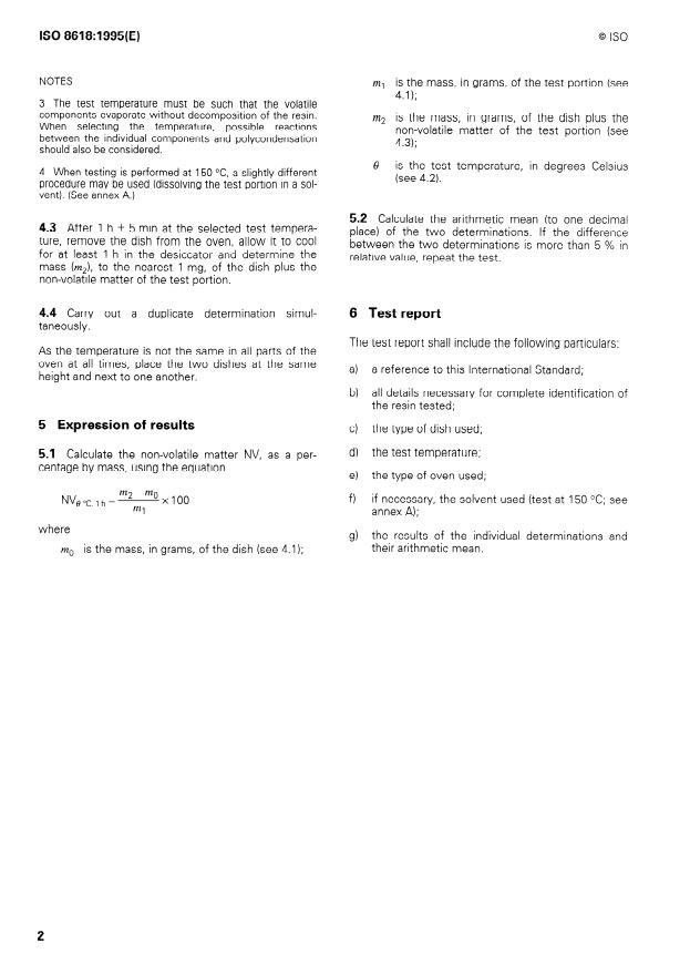 ISO 8618:1995 is a standard published by the International Organization for Standardization (ISO). Its full title is "Plastics — Liquid phenolic resins — Conventional determination of non-volatile matter". This standard covers: Specifies a method for the conventional determination of the non-volatile matter of liquid phenolic resins (resols, novolak solutions etc.). Applicable to commercial products or for resins in various stages of manufacture. Replaces the first edition.