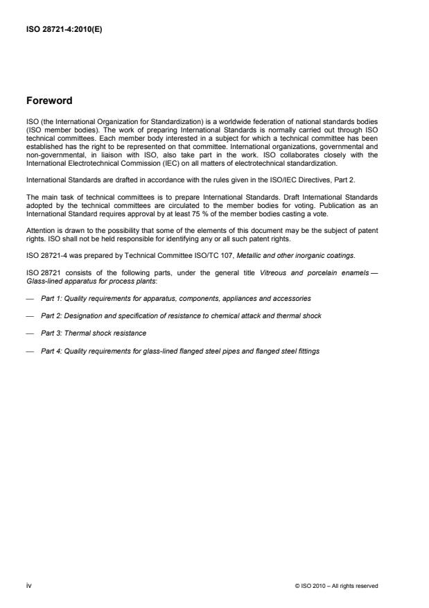ISO 28721-4:2010 is a standard published by the International Organization for Standardization (ISO). Its full title is "Vitreous and porcelain enamels — Glass-lined apparatus for process plants — Part 4: Quality requirements for glass-lined flanged steel pipes and flanged steel fittings". This standard covers: ISO 28721-4:2010 specifies the quality requirements for glass-lined flanged steel pipes and flanged steel fittings used for process plants.