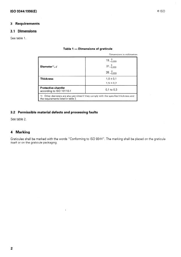 ISO 9344:1996 is a standard published by the International Organization for Standardization (ISO). Its full title is "Optics and optical instruments — Microscopes — Graticules for eyepieces". This standard covers: Gives dimensions and permissible material defects and processing faults of graticules with diameters of 19 mm, 21 mm and 26 mm to be used in microscope eyepieces for the purpose of measurement, assessment and comparison.