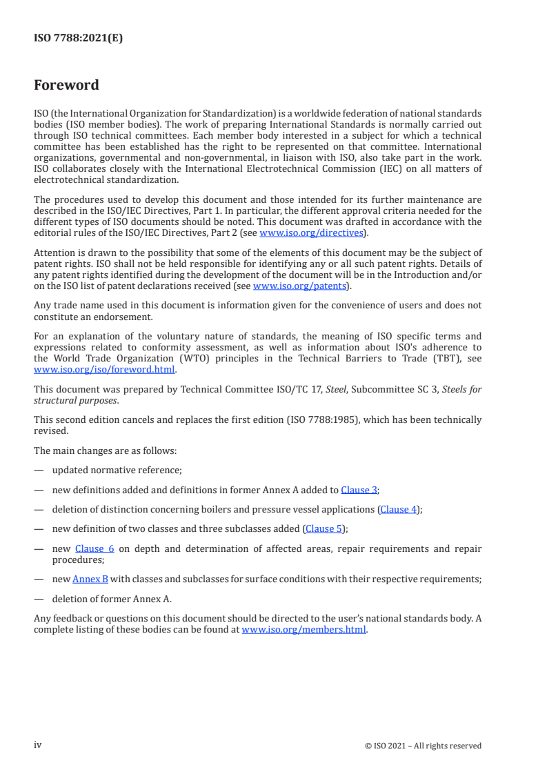 ISO 7788:2021 is a standard published by the International Organization for Standardization (ISO). Its full title is "Steel — Surface finish of hot-rolled plates and wide flats — Delivery requirements". This standard covers: This document specifies delivery requirements applicable to the surface finish of hot-rolled plates rolled on reversing mills and wide flats, with a nominal thickness ≥3 mm and ≤400 mm.