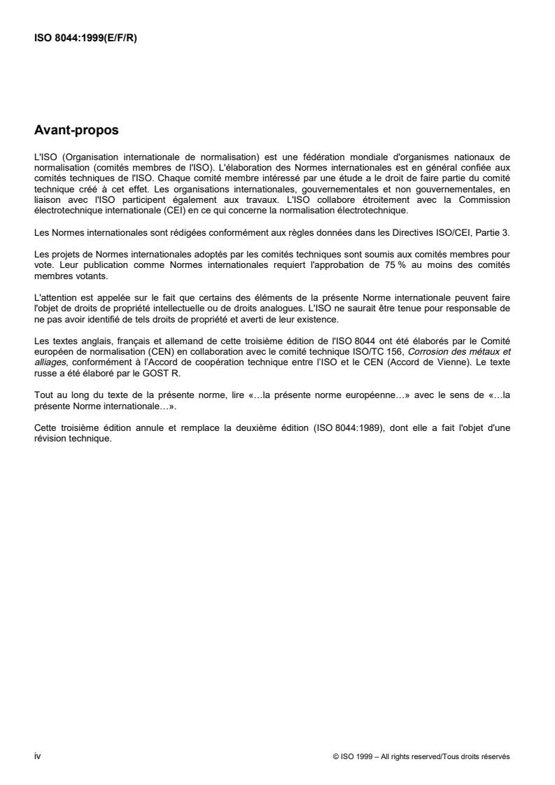 ISO 8044:1999 is a standard published by the International Organization for Standardization (ISO). Its full title is "Corrosion of metals and alloys — Basic terms and definitions". This standard covers: La présente norme internationale définit les termes relatifs à la corrosion qui sont largement employés dans les sciences et techniques modernes. Certaines définitions sont complétées par de brèves explications.NOTE 1 Dans tout le document on applique les conventions de I'IUPAC concernant le signe des potentiels d'électrode. Le terme "métal" est utilisé aussi pour désigner les alliages et autres matériaux métalliques.NOTE 2 Les termes et définitions relatifs au traitement de surface des métaux avec des revêtements inorganiques sont donnés dans prEN 12508: Protection contre la corrosion des métaux et alliages - Traitement de surface, revêtements métalliques et inorganiques - Vocabulaire.