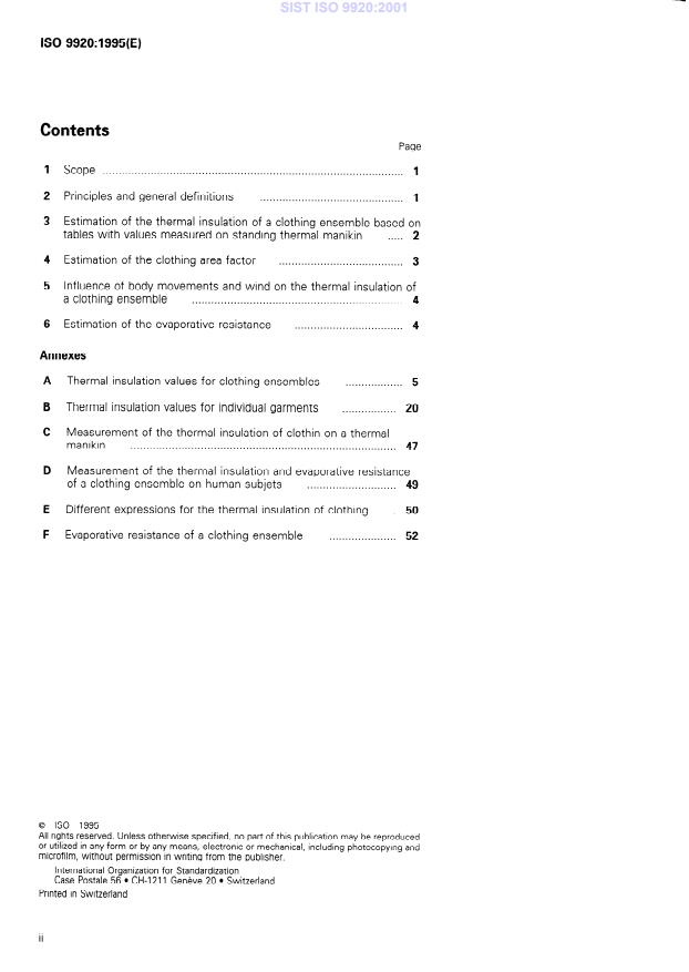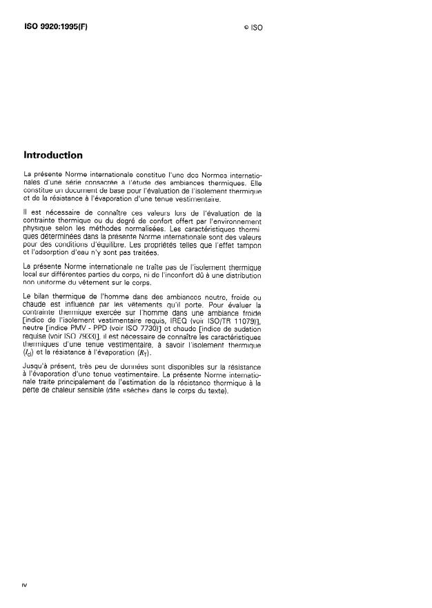 ISO 9920:1995 is a standard published by the International Organization for Standardization (ISO). Its full title is "Ergonomics of the thermal environment — Estimation of the thermal insulation and evaporative resistance of a clothing ensemble". This standard covers: Gives methods for estimating the thermal characteristics (resistance to dry heat loss and evaporative heat loss) in steady-state conditions for a clothing ensemble based on values for known garments, ensembles and textiles. Does not deal with other effects of clothing, such as adsorption of water, buffering, tactile comfort. Does not take into account the influence of rain and snow on the thermal characteristics. Does not consider special protective clothing. Does not deal with the separate insulation on different parts of the body and discomfort due to the asymmetry of a clothing ensemble.