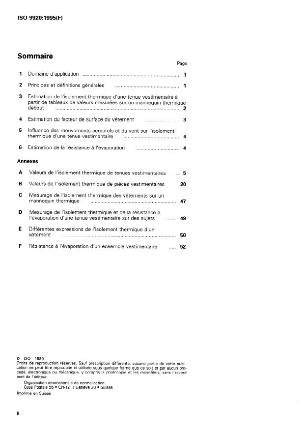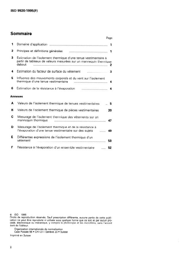 La présente Norme internationale prescrit des méthodes pour la détermination de l'isolement thermique (résistance à la perte de chaleur sèche du corps) et de la résistance à l'évaporation d'une tenue vestimentaire, à partir des valeurs de pièces vestimentaires, de tenues et de textiles connus, dans des conditions statiques. L'influence du mouvement du corps et de la pénétration de l'air sur l'isolement thermique et sur la résistance à l'évaporation est examinée. La présente Norme internationale -- ne traite par des autres effets des pièces vestimentaires, tels que l'adsorption d'eau, l'effet tampon, le confort au toucher; -- ne tient pas compte de l'influence de la pluie et de la neige sur les caractéristiques thermiques; -- n'est pas applicable aux tenues de protection spéciales (vêtements refroidis par eau, vêtements ventilés, vêtements chauffants); -- ne traite pas de l'isolement séparé sur différentes parties du corps, ni de l'inconfort dû à l'asymétrie d'une tenue vestimentaire.