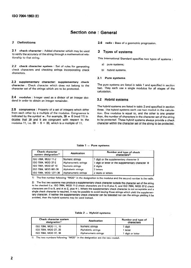 Lays down a set of check characters systems capable of protecting strings against errors occurring when copying or entering data. Defines conformance requirements for products described as generating check characters or checking strings.