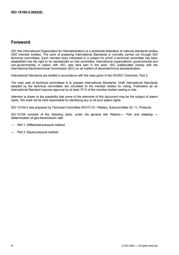 ISO 15105-2:2003 is a standard published by the International Organization for Standardization (ISO). Its full title is "Plastics — Film and sheeting — Determination of gas-transmission rate — Part 2: Equal-pressure method". This standard covers: ISO 15105-2:2003 specifies a method for the determination of the gas-transmission rate of any plastic material in the form of film, sheeting, laminate, co-extruded material or flexible plastic-coated material. Specific examples, currently in use, of the method are described in the annexes.