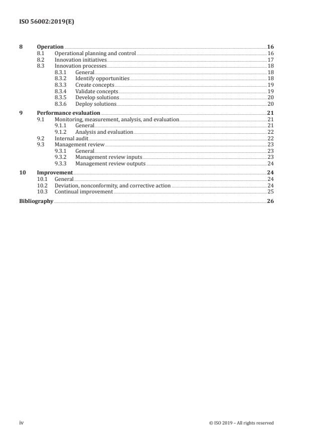 ISO 56002:2019 is a standard published by the International Organization for Standardization (ISO). Its full title is "Innovation management — Innovation management system — Guidance". This standard covers: 1.1 This document provides guidance for the establishment, implementation, maintenance, and continual improvement of an innovation management system for use in all established organizations. It is applicable to: a) organizations seeking sustained success by developing and demonstrating their ability to effectively manage innovation activities to achieve the intended outcomes; b) users, customers, and other interested parties, seeking confidence in the innovation capabilities of an organization; c) organizations and interested parties seeking to improve communication through a common understanding of what constitutes an innovation management system; d) providers of training in, assessment of, or consultancy for, innovation management and innovation management systems; e) policy makers, aiming for higher effectiveness of support programs targeting the innovation capabilities and competitiveness of organizations and the development of society. 1.2 All the guidance within this document is generic and intended to be applicable to: a) all types of organizations, regardless of type, sector, or size. The focus is on established organizations, with the understanding that both temporary organizations and start-ups can also benefit by applying these guidelines in all or in part; b) all types of innovations, e.g. product, service, process, model, and method, ranging from incremental to radical; c) all types of approaches, e.g. internal and open innovation, user-, market-, technology-, and design-driven innovation activities. It does not describe detailed activities within the organization, but rather provides guidance at a general level. It does not prescribe any requirements or specific tools or methods for innovation activities.