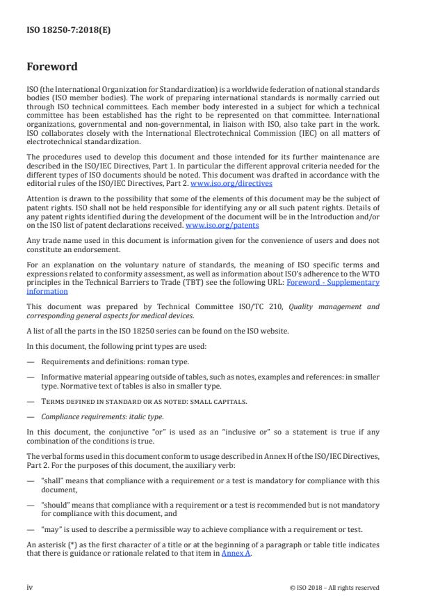 ISO 18250-7:2018 is a standard published by the International Organization for Standardization (ISO). Its full title is "Medical devices — Connectors for reservoir delivery systems for healthcare applications — Part 7: Connectors for intravascular infusion". This standard covers: This document specifies the interface dimensions and requirements for the design and functional performance of connectors intended to be used to connect intravascular infusion sets to intravascular infusion reservoirs. This document does not specify the dimensions and requirements for the medical devices or accessories that use these connectors. Such requirements are given in particular international standards for specific medical devices or accessories. EXAMPLES Medical devices which may use intravascular reservoir connectors are the following: — Administration ports on IV fluid reservoirs and the mating spikes of IV administration/intravascular infusion sets/lines, e.g., IV bags/containers and the spike inlet ends of IV sets; — Devices intended to be connected in series between the administration port of IV fluid reservoirs and the mating spikes of IV administration/giving lines; — Syringes and syringe IV sets utilizing Luer connectors. The following connectors are excluded from the scope of this document: — Stoppers for bottles as specified in ISO 8536-2; — Compounding/admixture ports on IV reservoirs and intended mating devices. EXAMPLES Rubber stoppers used for injection into the reservoir and the mating pharmacy admixture devices (syringes, needles, reconstitution devices, and other ancillary equipment used to access the compounding or admixture ports). — The fill ports of non-powered (i.e. elastomeric) pumps. NOTE 1 Details of alternative spikes that are in common use are located in Annex G for informational purposes. NOTE 2 Manufacturers are encouraged to incorporate the connectors specified in this document into intravascular infusion medical devices or accessories, even if not currently required by the particular medical device standards. It is expected that when the particular medical device standards are revised, requirements for reservoir connectors, as specified in ISO 18250, will be included.