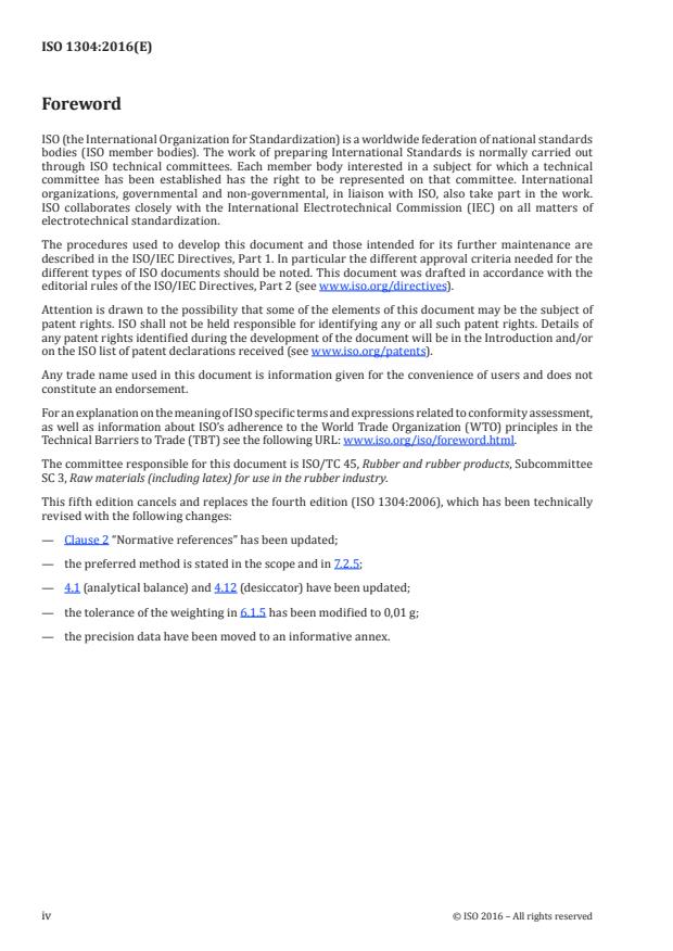 ISO 1304:2016 is a standard published by the International Organization for Standardization (ISO). Its full title is "Rubber compounding ingredients - Carbon black - Determination of iodine adsorption number". This standard covers: ISO 1304:2016 specifies methods for the determination of iodine adsorption number of carbon blacks for use in the rubber industry. Two titration methods are described: - method A: titration using a burette and starch as indicator; - method B: potentiometric titration with an automatic titrator. The iodine adsorption number is related to the surface area of a carbon black and is generally in agreement with the nitrogen surface area. However, it is significantly depressed in the presence of a high content of volatile or solvent-extractable materials; the iodine adsorption number therefore does not always provide a measure of the specific surface area of a carbon black. Ageing of carbon black can also influence the iodine number. In case of dispute, the preferred method is method B (potentiometric titration).