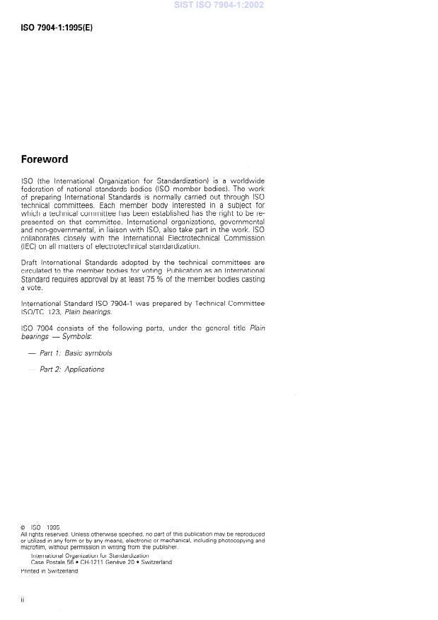 ISO 7904-1:1995 is a standard published by the International Organization for Standardization (ISO). Its full title is "Plain bearings — Symbols — Part 1: Basic symbols". This standard covers: Defines basic symbols for use in the field of plain bearings, additional signs are also defined for use as superscripts and subscripts. The system is founded on characters of the Latin and Greek alphabets, Arabic figures and other signs, e.g. points, commas, horizontal lines or asterisks. For the purpose of international applicability, all symbols have been derived from English words. The present classification may be used in calculations and technological and geometrical determinations as well as in the quality assurance of plain bearings.