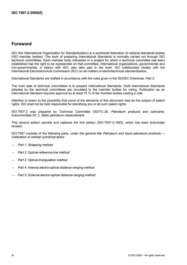 ISO 7507-2:2005 is a standard published by the International Organization for Standardization (ISO). Its full title is "Petroleum and liquid petroleum products — Calibration of vertical cylindrical tanks — Part 2: Optical-reference-line method". This standard covers: ISO 7507-2:2005 specifies a method for the calibration of tanks above eight metres in diameter with cylindrical courses that are substantially vertical. It provides a method for determining the volumetric quantity contained within a tank at gauged liquid levels. The optical (offset) measurements required to determine the circumferences can be taken internally or externally. The method specified in ISO 7507-2:2005 is suitable for tilted tanks with up to 3 % deviation from the vertical provided that a correction is applied for the measurement tilt, as described in ISO 7507-1. This method is an alternative to other methods such as strapping (ISO 7507-1) and the optical-triangulation method (ISO 7507-3).