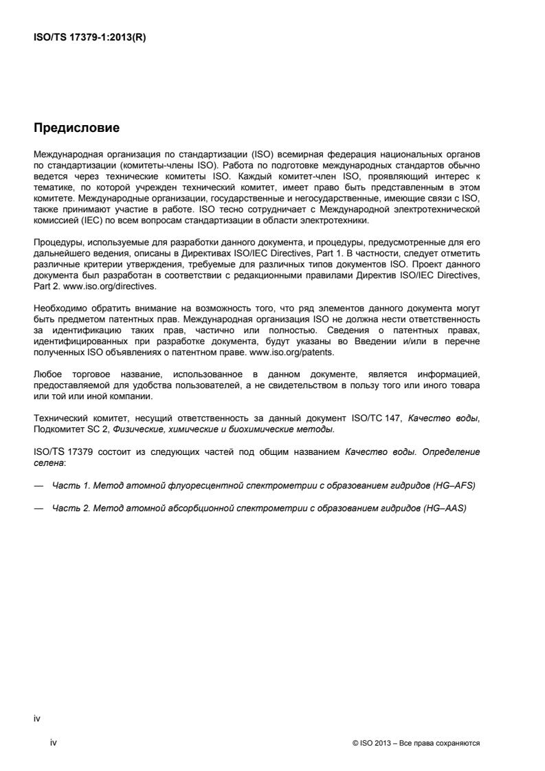 ISO/TS 17379-1:2013 is a technical specification published by the International Organization for Standardization (ISO). Its full title is "Water quality — Determination of selenium — Part 1: Method using hydride generation atomic fluorescence spectrometry (HG-AFS)". This standard covers: ISO/TS 17379-1:2013 specifies a method for the determination of selenium. The method is applicable to drinking water, surface water, ground water, and rain water. The application range of ISO/TS 17379-1:2013 is from 0,02 µg/l to 100 µg/l. Samples containing selenium at higher concentrations than the application range can be analysed following appropriate dilution. The method is unlikely to detect organoselenium compounds. The sensitivity of this method is dependent on the operating conditions selected.