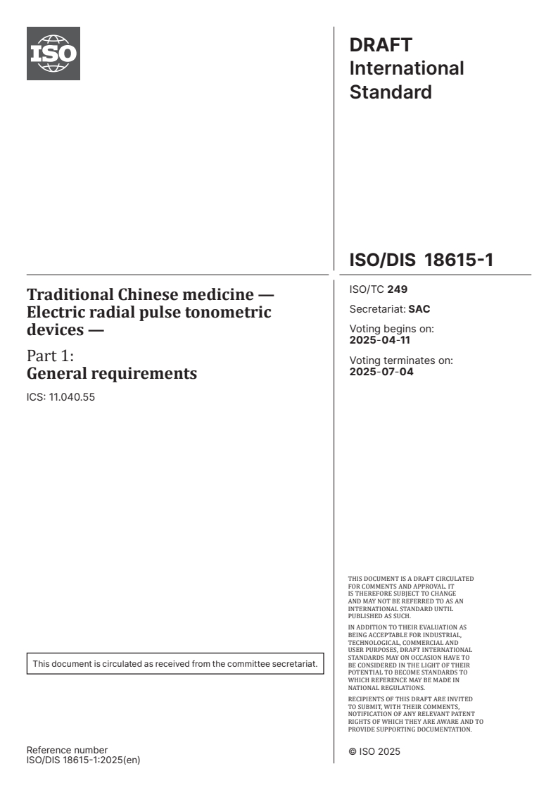 ISO/FDIS 18615-1 - Traditional Chinese medicine — Electric radial pulse tonometric devices — Part 1: General requirements/14/2025