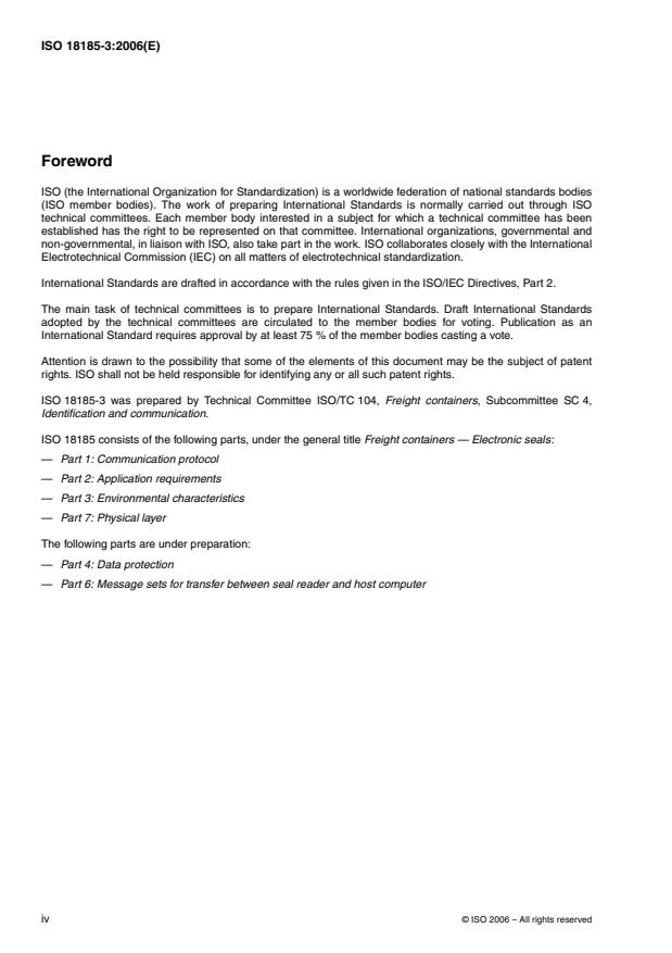 ISO 18185-3:2006 is a standard published by the International Organization for Standardization (ISO). Its full title is "Freight containers — Electronic seals — Part 3: Environmental characteristics". This standard covers: ISO 18185-3:2006 specifies the minimum environmental characteristics for electronic seals. ISO 18185-3:2006 describes the environmental requirements for the ISO 18185 series, for ISO 10374 (Freight containers -- RF automatic identification) and for ISO 17363 (Supply chain applications of RFID -- Freight containers), since it is expected that the implementation of these International Standards will face the same environmental conditions. However, each of these International Standards has its own unique requirements other than environmental conditions.