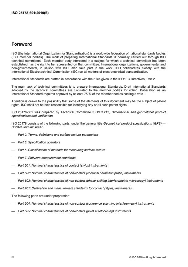 ISO 25178-601:2010 is a standard published by the International Organization for Standardization (ISO). Its full title is "Geometrical product specifications (GPS) - Surface texture: Areal - Part 601: Nominal characteristics of contact (stylus) instruments". This standard covers: ISO 25178-601:2010 defines the metrological characteristics of contact (stylus) areal surface texture measuring instruments.