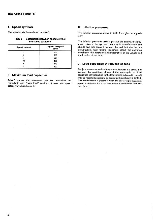 Keywords: ISO 4249-2:1990, motorcycle tyres, tyre load ratings, load index, tyre load-carrying capacity, speed symbol, maximum load capacities, inch code-designated series.