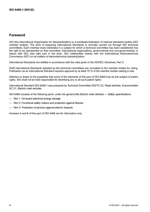 ISO 6469-1:2001 is a standard published by the International Organization for Standardization (ISO). Its full title is "Electric road vehicles — Safety specifications — Part 1: On-board electrical energy storage". This standard covers: Electric road vehicles — Safety specifications — Part 1: On-board electrical energy storage