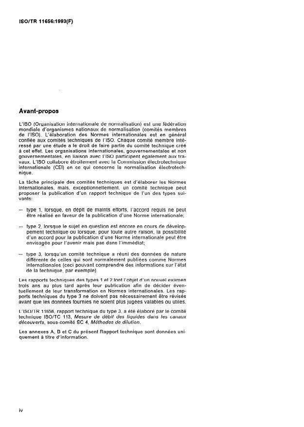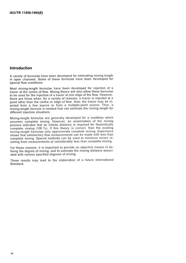 ISO/TR 11656:1993 is a technical report published by the International Organization for Standardization (ISO). Its full title is "Measurement of liquid flow in open channels — Mixing length of a tracer". This standard covers: Investigates cross-channel mixing characteristics of solutes injected in streams. Specifically, it relates to the use of tracers for the measurement of discharge. The purpose of the report is as follows: to compare methods of defining the degree of mixing; to compare methods of estimating the mixing length and to recommend a particular method; to investigate the errors in dilution measurements associated with incomplete mixing; to discuss methods of reducing errors in dilution-discharge measurements when mixing is incomplete.