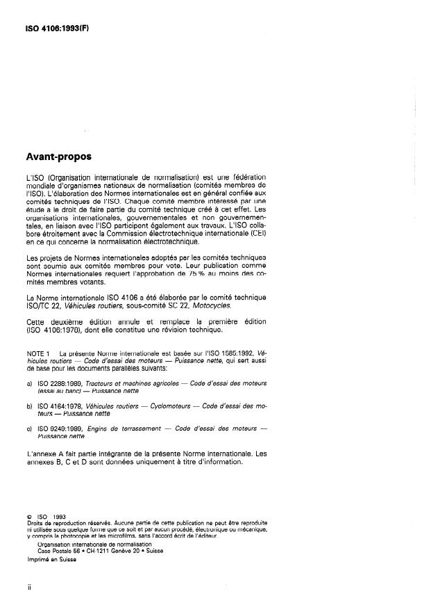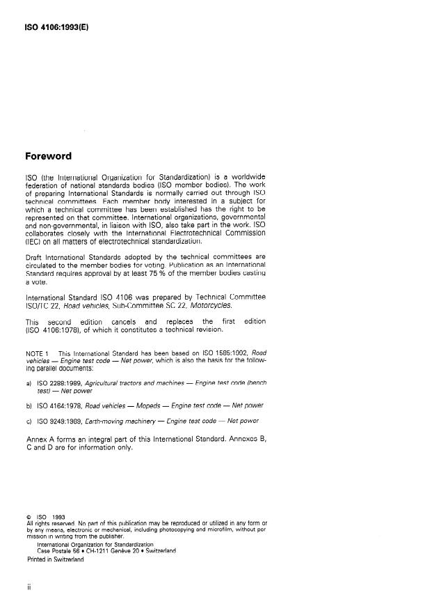 ISO 4106:1993 is a standard published by the International Organization for Standardization (ISO). Its full title is "Motorcycles — Engine test code — Net power". This standard covers: Specifies a method for testing engines as defined in ISO 3833:1977. Applies to the evaluation of their performance with a view, in particular, to presenting curves of power and specific fuel consumption at full load as a function of engine rotational speed. Concerns internal combustion engines used for propulsion of motorcycles and included in one of the following categories: reciprocating internal combustion engines (spark-ignition) but excluding free piston engines, or rotary piston engines.