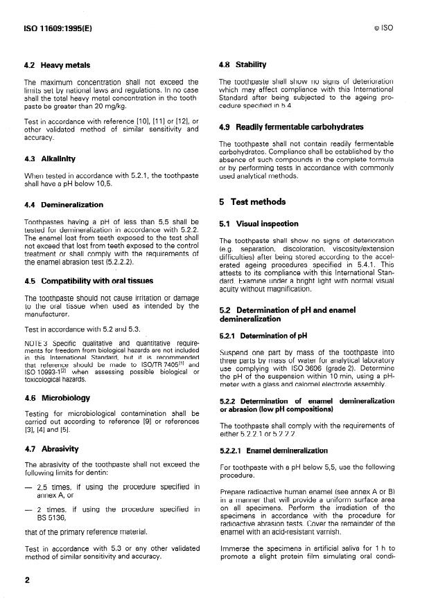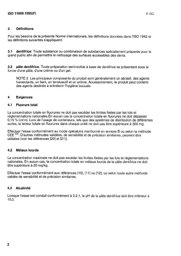 ISO 11609:1995 is a standard published by the International Organization for Standardization (ISO). Its full title is "Dentistry — Toothpastes — Requirements, test methods and marking". This standard covers: Gives requirements and test methods for physical and chemical properties, and for marking and/or labelling of toothpastes for daily use with a toothbrush.