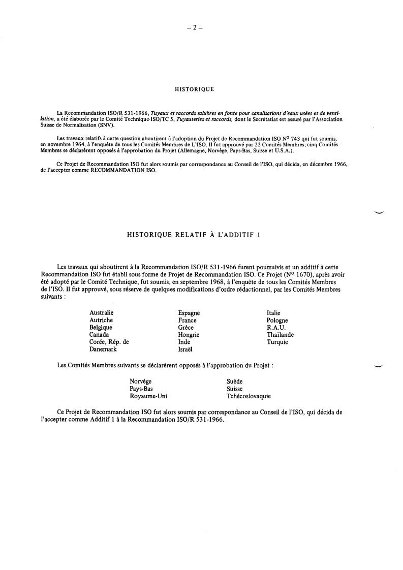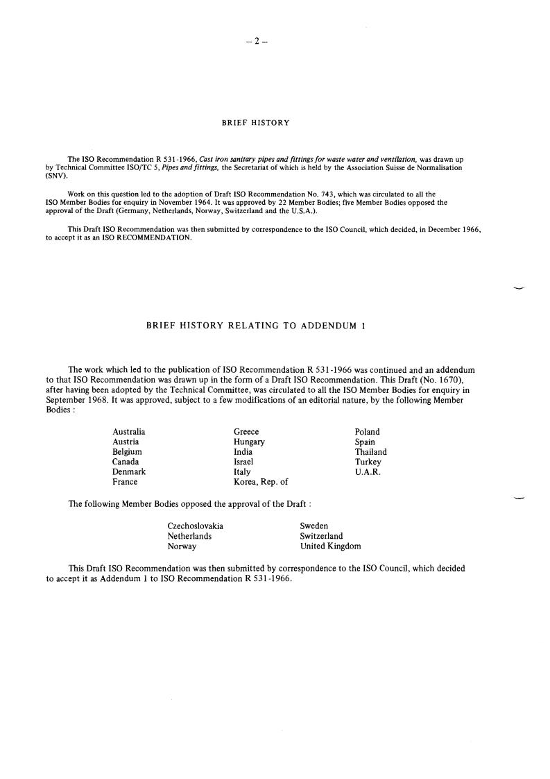 The IS0 Recommendation R 531 -1966, Cast iron sanitary pipes and fittings for waste water and ventilation, was drawn up