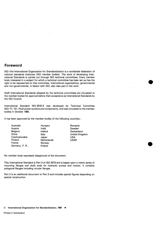 ISO 3019-3:1981 - Hydraulic fluid power — Positive displacement pumps and motors — Dimensions and identification code for mounting flanges and shaft ends — Part 3: Polygonal flanges (including circular flanges) Released:12/1/1981