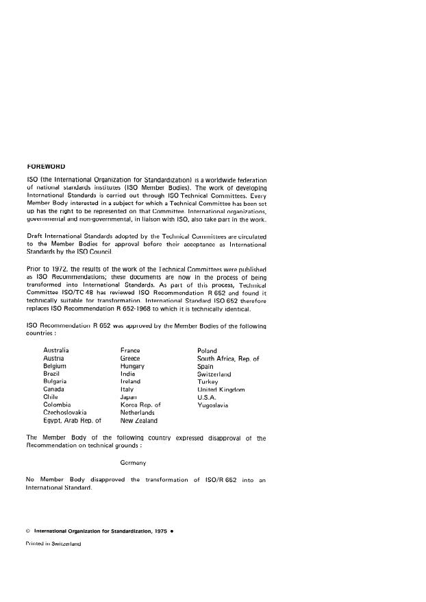IS0 Recommendation R 652 was approved by the Member Bodies of the following