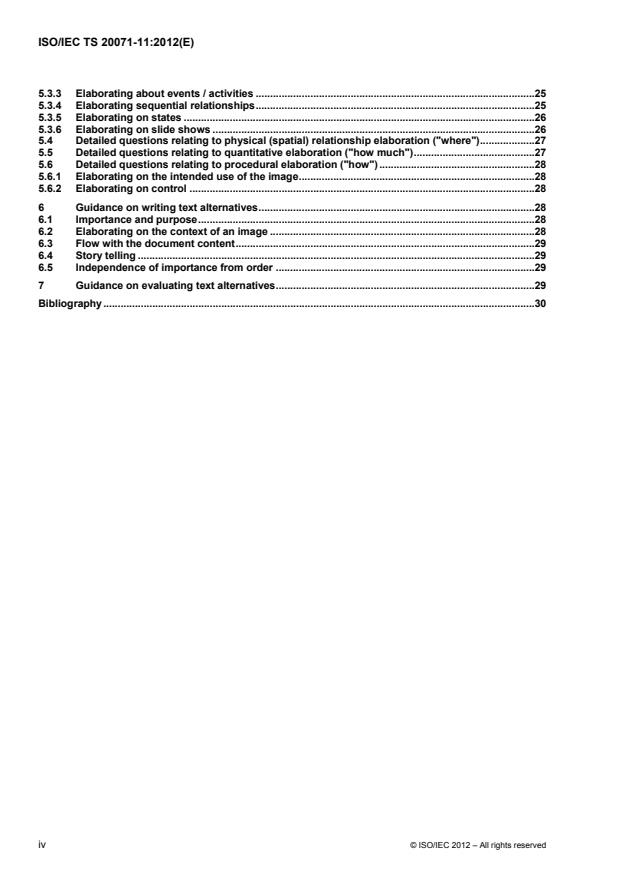 ISO/IEC TS 20071-11:2012 is a technical specification published by the International Organization for Standardization (ISO). Its full title is "Information technology — User interface component accessibility — Part 11: Guidance for alternative text for images". This standard covers: ISO/IEC TS 20071-11:2012 applies to all static images that are used in any type of electronic document. It also applies to individual images within a slide show of electronic images. ISO/IEC TS 20071-11:2012 does not apply to moving images (e.g. movies). The guidance contained in ISO/IEC TS 20071-11:2012 is intended to be used by the person who creates content to be placed in an electronic document. There is no expectation that this person will have any additional expertise beyond understanding the contents of the document and why an image was chosen to be placed within the document. While the main intent of the guidance within ISO/IEC TS 20071-11:2012 is the creation of text alternatives, the information identified in this guidance could be placed in the main document text, reducing the length of the resulting text alternatives. However, placing information in the main document text does not fully replace the function of having some text alternatives for each image.