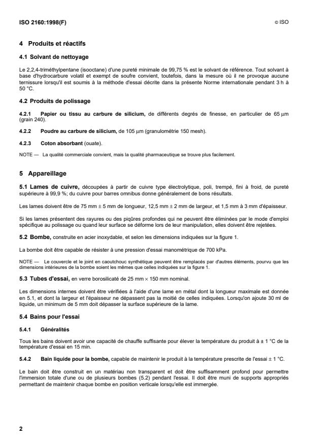 ISO 2160:1998 is a standard published by the International Organization for Standardization (ISO). Its full title is "Petroleum products - Corrosiveness to copper - Copper strip test". This standard covers: La présente Norme internationale prescrit une méthode d'essai pour la détermination de l'action corrosive des produits pétroliers liquides et de certains solvants sur le cuivre, y compris les produits volatils ayant une tension de vapeur Reid inférieure ou égale à 124 kPa à 37,8 °C. Il est recommandé de tester les produits volatils ayant une tension de vapeur supérieure à 124 kPa à 37,8 °C conformément à l'ISO 6251 (voir l'avertissement ci-dessous), et de tester les huiles isolantes électriques conformément à l'ISO 5662. AVERTISSEMENT -- Certains produits, en particulier l'essence de gaz naturel, peuvent avoir une tension de vapeur significativement supérieure à ce qui est caractéristique de leur classe, même en dessous de 124 kPa à 37,8 °C. Pour cette raison, il faut s'assurer que la bombe contenant un tel produit ne soit pas placée dans le bain thermostatique à 100 °C. De tels échantillons peuvent développer à 100 °C une pression suffisante pour provoquer la rupture de la bombe, et causer des dommages et blessures.