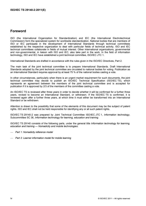 ISO/IEC TS 29140-2:2011 is a technical specification published by the International Organization for Standardization (ISO). Its full title is "Information technology for learning, education and training — Nomadicity and mobile technologies — Part 2: Learner information model for mobile learning". This standard covers: ISO/IEC TS 29140-2:2011 provides a learner information model specific to mobile learning that can be used as a reference by software developers, implementers, instructional designers, trainers, automated systems, and learning management systems to ensure that learning, education, and training (LET) environments reflect the specific needs of mobile participants. Since these needs impact on other standardization efforts and other work items in LET, a concise view is necessary. ISO/IEC TS 29140-2:2011 provides a definition of mobile learning that is appropriate for all sectors in LET, the description of the learner information model for mobile learning, specific learner information that supports learners engaged in mobile learning activities in LET environments. In addition, ISO/IEC TS 29140-2:2011 provides some initial guidance regarding the issue of privacy. This includes ensuring that ISO/IEC TS 29140-2:2011 does not contravene any privacy requirements.