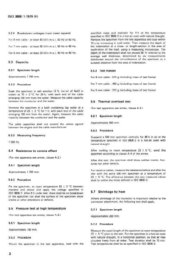 ISO 3808-1:1979 is a standard published by the International Organization for Standardization (ISO). Its full title is "Road vehicles — Unscreened high-tension ignition cables — Part 1: Dimensions, general requirements and test methods". This standard covers: Applies to all types of unscreened high-tension ignition cables used in automotive vehicles. Describes tests for: insulation faults, 30 minute test voltage and breakdown voltage, capacity, resistance to corona effect, pressure at high temperature, thermal overload, shrinkage by heat, resistance to flame propagation, flexibility at low temperature, mechanical tensile, stripping of insulation, resistance to oil, resistance to fuel, and accelerated life test. An annex contains five figures which illustrate the test apparatus used for various tests.