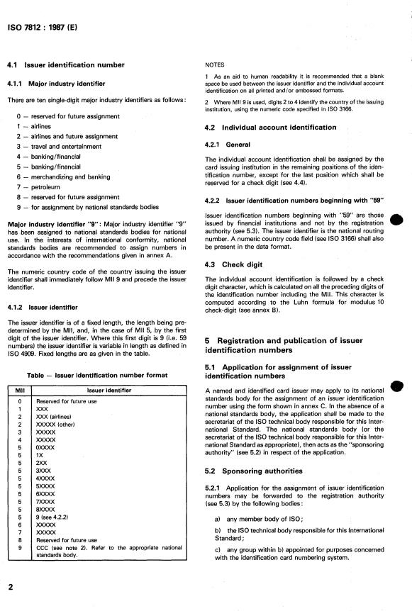 ISO 7812:1987 is a standard published by the International Organization for Standardization (ISO). Its full title is "Identification cards — Numbering system and registration procedure for issuer identifiers". This standard covers: Identification cards — Numbering system and registration procedure for issuer identifiers