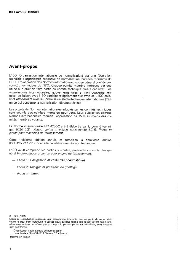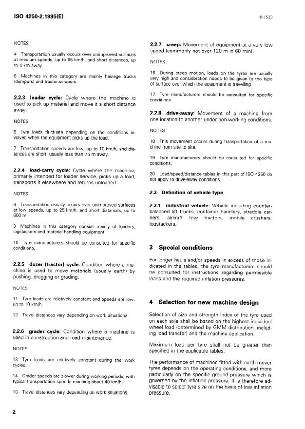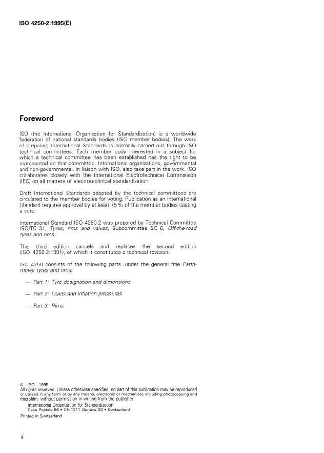 ISO 4250-2:1995 is a standard published by the International Organization for Standardization (ISO). Its full title is "Earth-mover tyres and rims — Part 2: Loads and inflation pressures". This standard covers: Gives definitions of masses, operating conditions and load cycles, and defines tyre loads and reference inflation pressures for narrow and wide base tyres primarily used for earth-mover machines. Cancels and replaces the second edition, which has been technically revised.