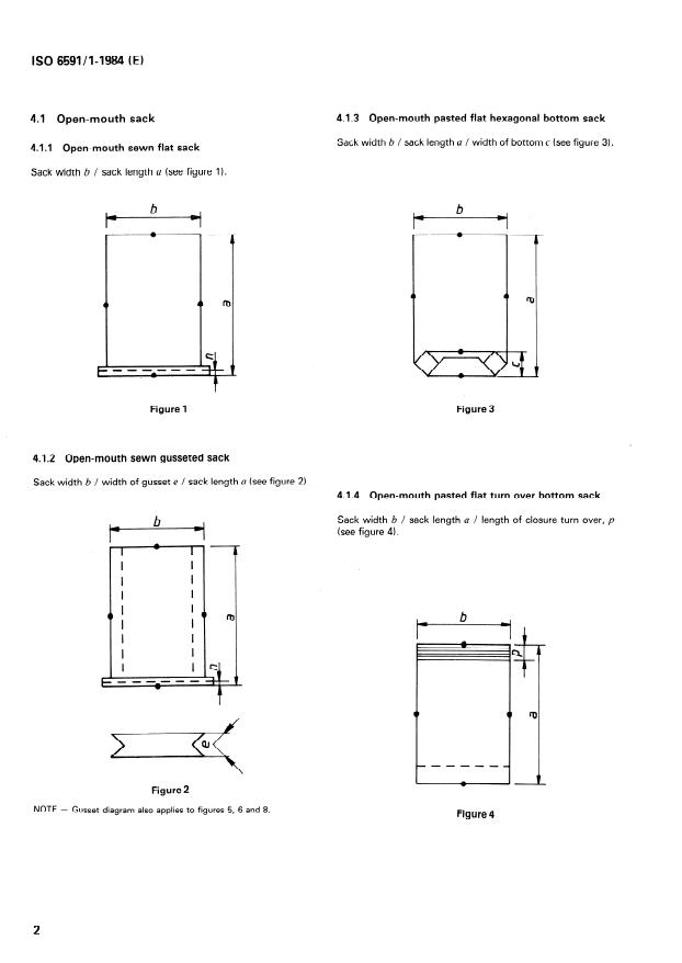 - Dimensional designation: Sacks are identified by type (open-mouth, valved, sewn, pasted, gusseted, etc.) and by a sequence of dimensions (for example, open-mouth sewn flat sack = b / a; valved sewn flat sack = b / a / g (v) / f / (i)).
