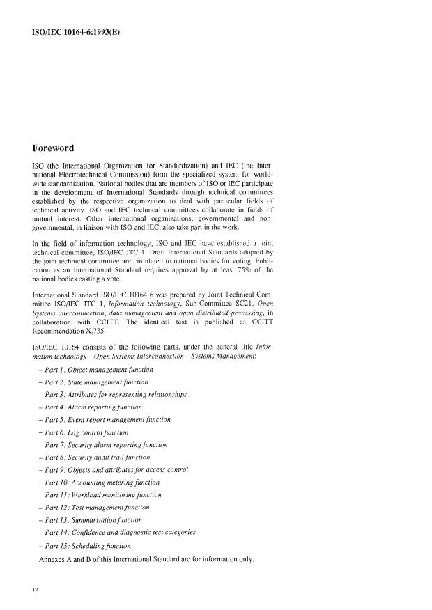 ISO/IEC 10164-6:1993 is a standard published by the International Organization for Standardization (ISO). Its full title is "Information technology — Open Systems Interconnection — Systems Management: Log control function". This standard covers: Establishes user requirements for the log control function; establishes models that relate the services provided by the function to user requirements; defines the services provided by the function; specifies the protocol that is necessary in order to provide the services; defines the relationship between the services and SMI operations and notifications; defines relationships with other systems management function; specifies conformance requirements.