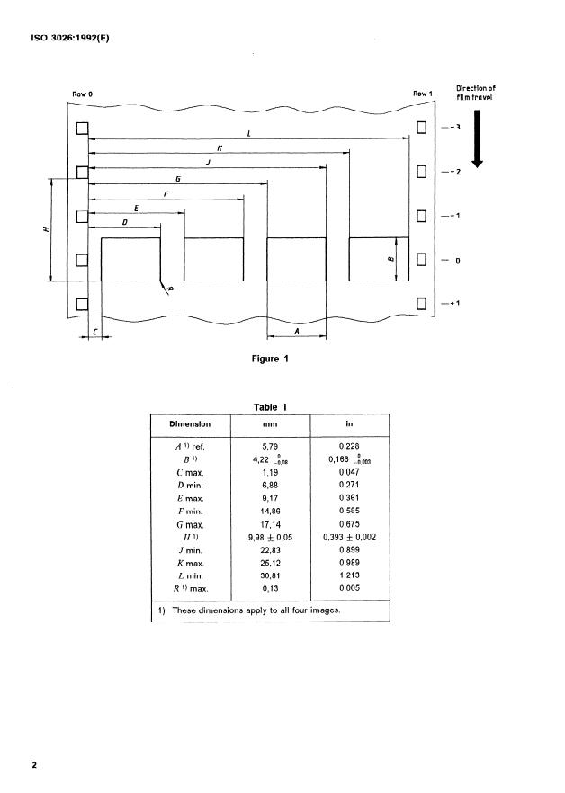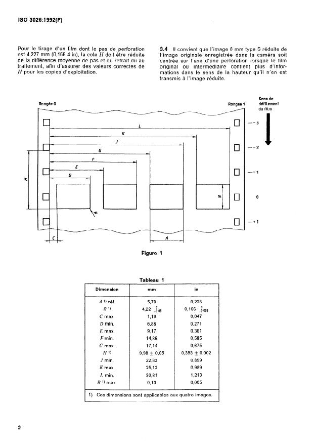 ISO 3026:1992 is a standard published by the International Organization for Standardization (ISO). Its full title is "Cinematography — Printed 8 mm Type S image area on 35 mm motion-picture film perforated 8 mm Type S, 2R-4.227 (1664) or 5R-4.234 (1667) — Position and dimensions". This standard covers: The dimensions which define the image area are established from the row of perforations discarded after slitting. This row contains a wider perforation and is customarily used for lateral resgistration of the image. Annex A describes the use of a registration device for prints made with a step printer.