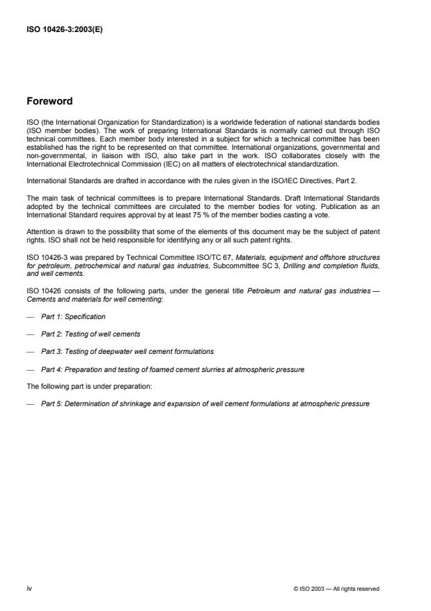 ISO 10426-3:2003 is a standard published by the International Organization for Standardization (ISO). Its full title is "Petroleum and natural gas industries — Cements and materials for well cementing — Part 3: Testing of deepwater well cement formulations". This standard covers: ISO 10426-3:2003 provides procedures for testing well cements and cement blends for use in the petroleum and natural gas industries in a deepwater environment.