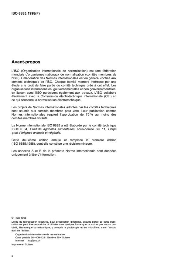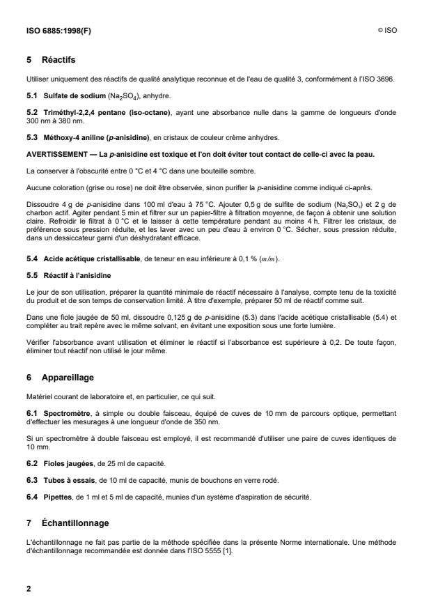 ISO 6885:1998 is a standard published by the International Organization for Standardization (ISO). Its full title is "Animal and vegetable fats and oils — Determination of anisidine value". This standard covers: La présente Norme internationale spécifie une méthode de détermination de l'indice d'anisidine qui est une mesure de la quantité d'aldéhydes (principalement alkène-2 als) présents dans les corps gras d'origines animale et végétale.
