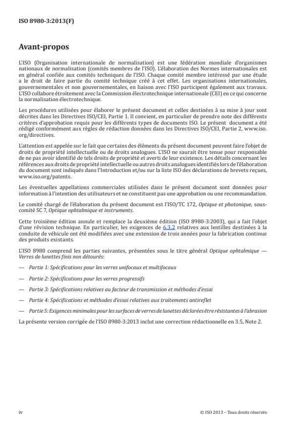 ISO 8980-3:2013 is a standard published by the International Organization for Standardization (ISO). Its full title is "Ophthalmic optics — Uncut finished spectacle lenses — Part 3: Transmittance specifications and test methods". This standard covers: ISO 8980-1:2013 specifies requirements for the transmittance properties of uncut finished spectacle lenses and mounted pairs, including attenuation of solar radiation.