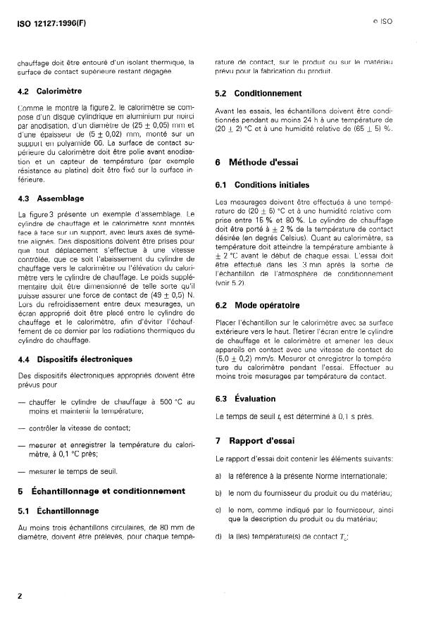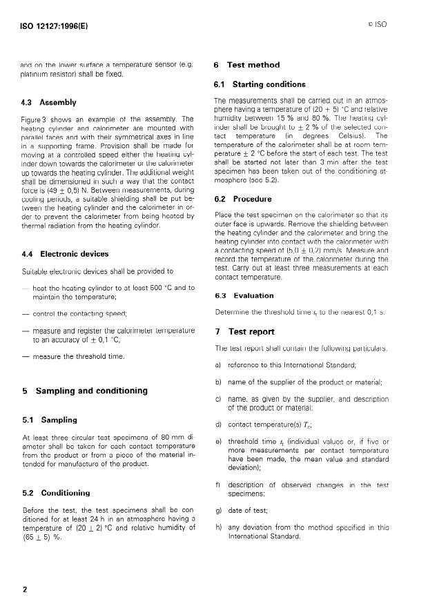 ISO 12127:1996 is a standard published by the International Organization for Standardization (ISO). Its full title is "Clothing for protection against heat and flame — Determination of contact heat transmission through protective clothing or constituent materials". This standard covers: Gives a test method for the determination of contact heat transmission. Applies to protective clothing including protective gloves intended to protect against high contact temperatures. Scope of application is restricted to contact temperatures between 100 °C and 500 °C.