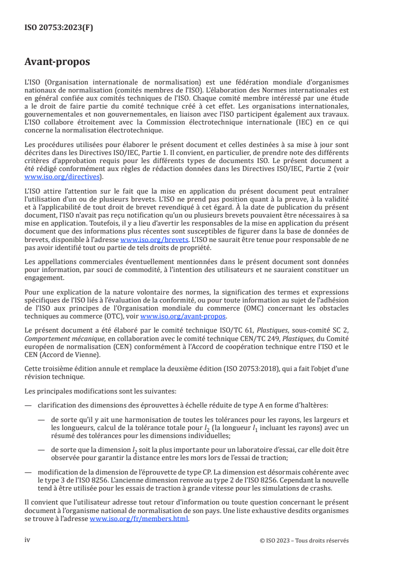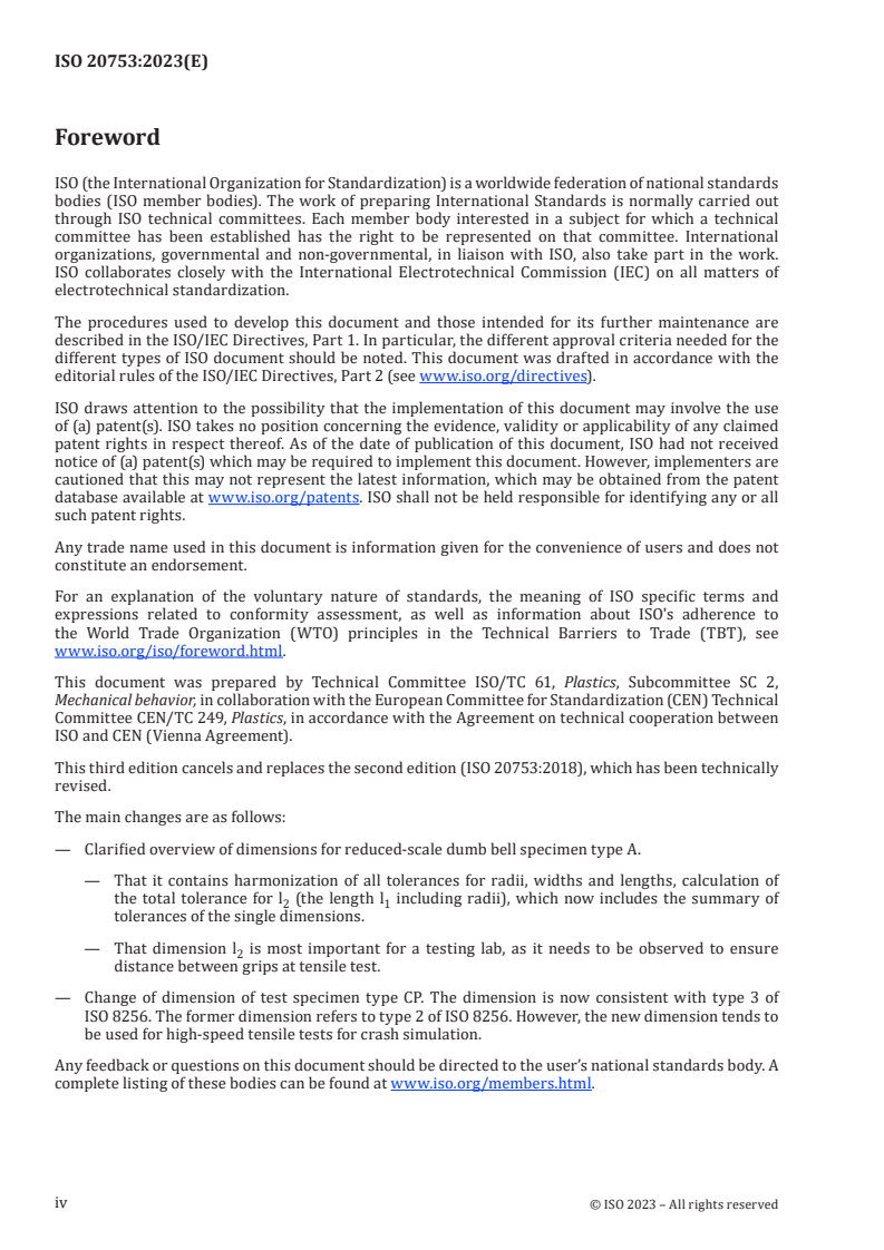 ISO 20753:2023 is a standard published by the International Organization for Standardization (ISO). Its full title is "Plastics - Test specimens". This standard covers: This document specifies dimensional requirements relating to test specimens prepared from plastics materials intended for processing by moulding, as well as to test specimens prepared by machining from sheets or shaped articles. It compiles the designations and dimensions of test specimens used for the acquisition of comparable data and of other frequently used specimens. The following types of test specimen are specified: A Tensile specimen, multipurpose or reduced-scale B Bar specimen C Small tensile specimen D Square plate specimen F Rectangular plate specimen NOTE If a particular type of test specimen is not mentioned in this document, this does not mean that there is any intention to exclude the use of the specimen. Additional specimen types can be added in future if they are commonly used.