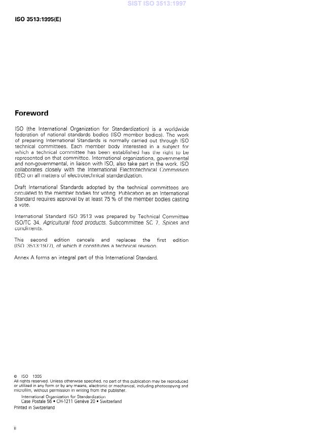 ISO 3513:1995 is a standard published by the International Organization for Standardization (ISO). Its full title is "Chillies — Determination of Scoville index". This standard covers: Cancels and replaces the first edition (1977). Specifies a method for the determination of the Scoville index of chillies, whole or ground, unadulterated by other spices or products.