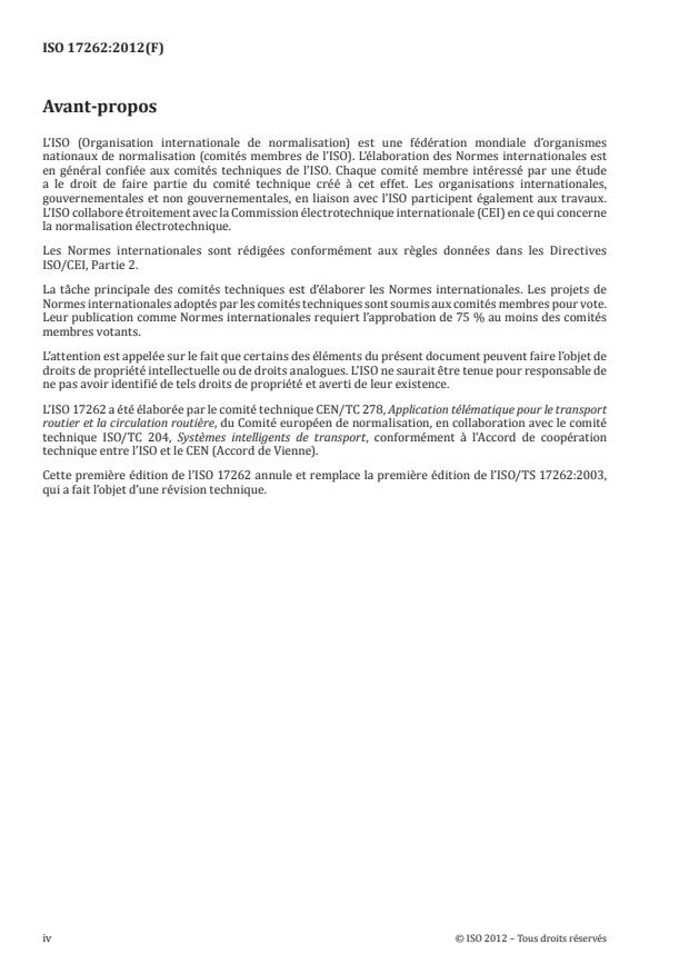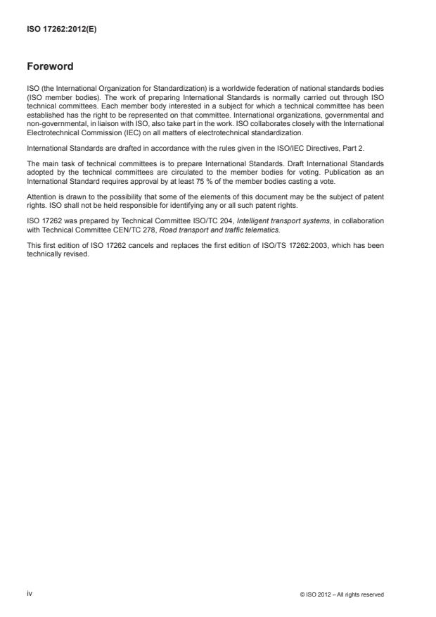ISO 17262:2012 is classified under the following ICS (International Classification for Standards) categories: 03.220.20 - Road transport; 35.240.60 - IT applications in transport. The ICS classification helps identify the subject area and facilitates finding related standards.