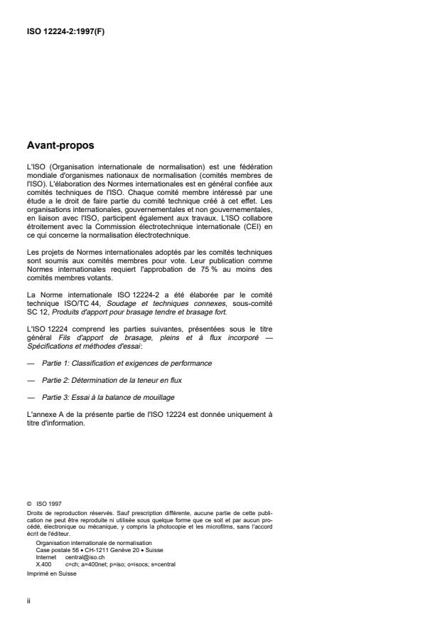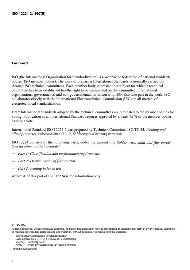 ISO 12224-2:1997 is a standard published by the International Organization for Standardization (ISO). Its full title is "Flux cored solder wire — Specification and test methods — Part 2: Determination of flux content". This standard covers: Flux cored solder wire — Specification and test methods — Part 2: Determination of flux content